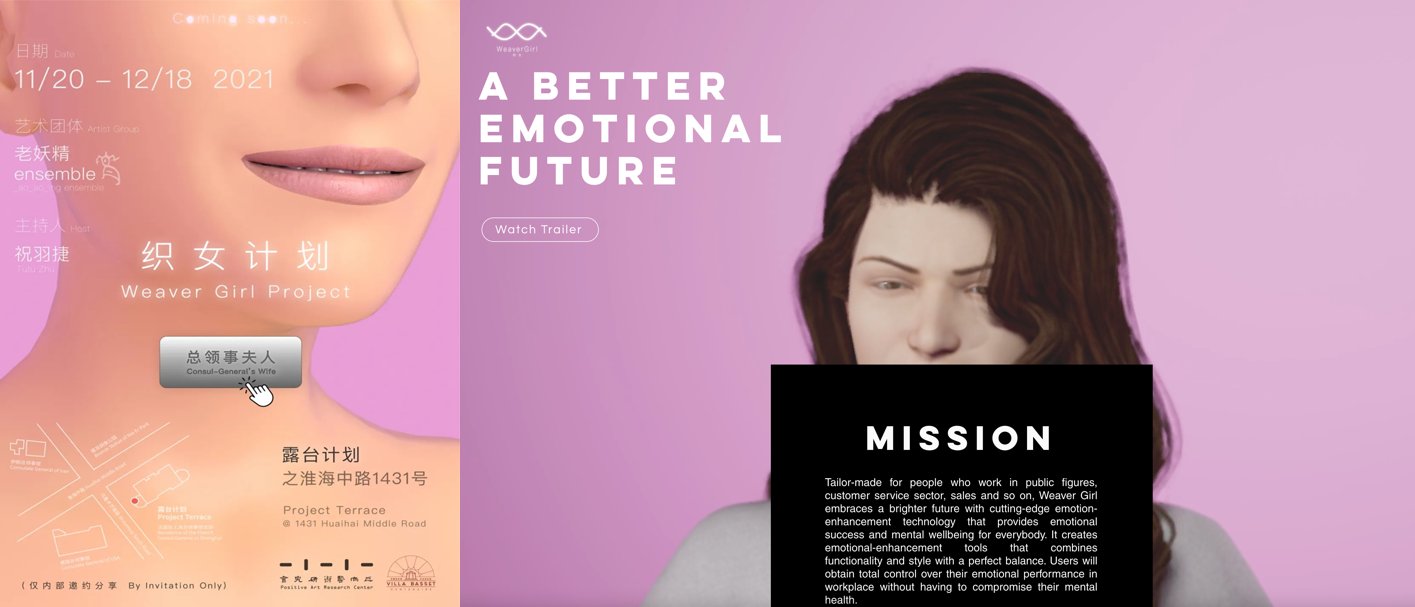 Three tabs are currently displayed side by side on my Google Chrome browser: the official website of the emotional enhancement tool “Weaver Girl”, an online invitation to the launch party of the “Weaver Girl” series products, and the video documentation of the performance, curated and performed by _ao_ao_jing ensemble (which means “old witches” in Chinese): WeaverGirl: Special Design for Consul General’s Wives (CGW001). No matter which website I choose to look at first, or if I decide to ignore some of the information from the websites shown instead, I have been involuntarily part of a role-playing discourse from the moment I clicked on the link of the webpage. I act as one of the model audiences, , and a floating soul, caught between the development of technology and power structures.