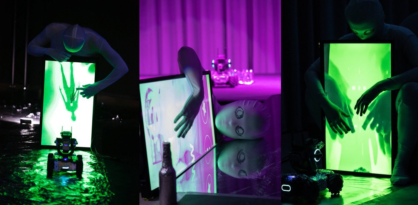 In his book Postdramatic Theatre, Dr. Hans-Thies Lehmann claims that “Postdramatic theatre is a theatre of the present. Reformulating presence as present, in allusion to Bohrer’s concept of the ‘absolute present tense’ (‘das absolute Präsens’), means, above all, to conceive of it as a process, as a verb. It can be neither object, nor substance, nor the object of cognition in the sense of a synthesis effected by the imagination and the understanding.1 In We Don’t Have Bodies Yet, Paul B. Preciado states that “Science, technology and the market are redrawing the limits of what is now and what will be a living human body tomorrow. These limits are defined not just in relation to animality and forms of life that historically have been considered sub-human (proletarian, non-white, non-masculine, trans, crip, disabled, migrant…), but also in relation to the machine, to artificial intelligence.” 2